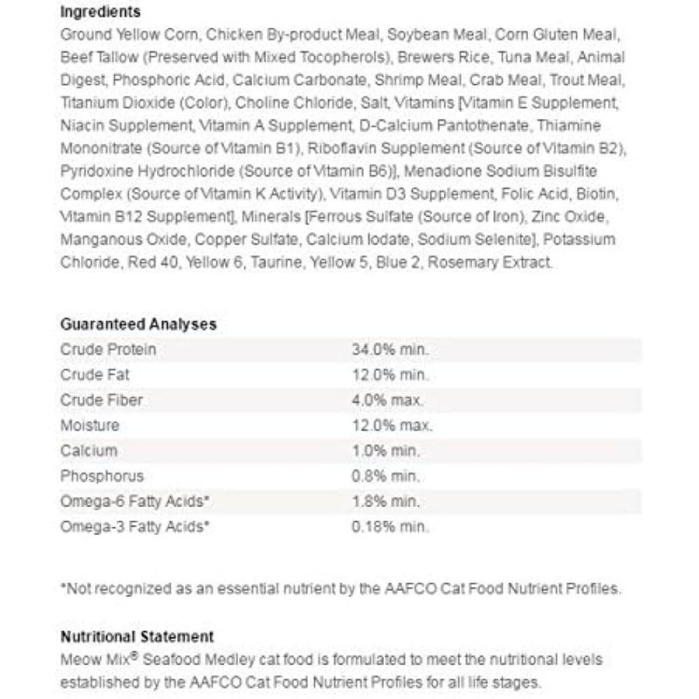 المكونات الذرة المطحونة الكاملة ، وجبة الدجاج الثانوية ، وجبة فول الصويا ، وجبة غلوتين الذرة ، شحم البقر (المحفوظ مع خليط توكوفيرول) ، أرز البيرة ، وجبة التونة ، هضم الحيوان ، حمض الفوسفوريك ، كربونات الكالسيوم ، وجبة الجمبري ، وجبة السلطعون ، وجبة سمك السلمون المرقط ، كلوريد الكولين ، ثاني أكسيد التيتانيوم (اللون) ، l-lysine monohydrochloride ، ملح ، فيتامينات (مكمل فيتامين هـ ، النياسين ، مكمل فيتامين أ ، أحادي نترات الثيامين ، مكمل الريبوفلافين ، بانتوثينات الكالسيوم د ، هيدروكلوريد البيريدوكسين ، مكمل فيتامين ب 12 ، ميناديون ثنائي سلفيت الصوديوم مركب (مصدر نشاط فيتامين ك) ، مكمل فيتامين د 3 ، حمض الفوليك ، البيوتين) ، كلوريد البوتاسيوم ، المعادن (كبريتات الحديدوز ، أكسيد الزنك ، أكسيد المنغنيز ، كبريتات النحاس ، يودات الكالسيوم ، سيلينيت الصوديوم) ، التورين ، دل ميثيونين ، أحمر 40 ، حمض اللاكتيك ، أصفر 6 ، أصفر 5 ، أزرق 2 ، خلاصة إكليل الجبل.