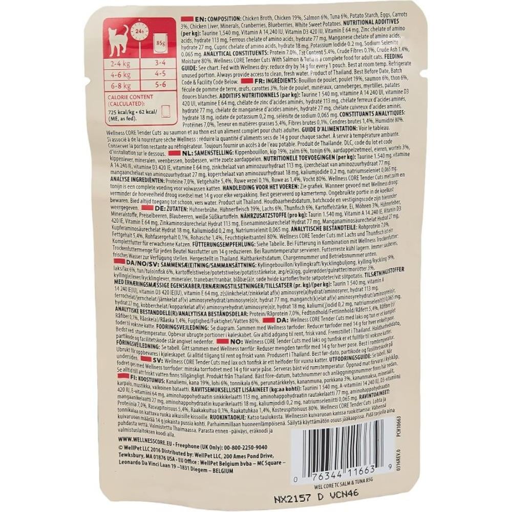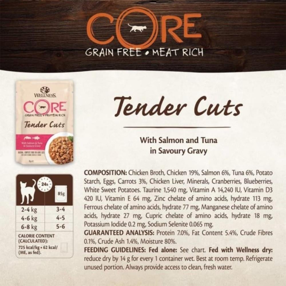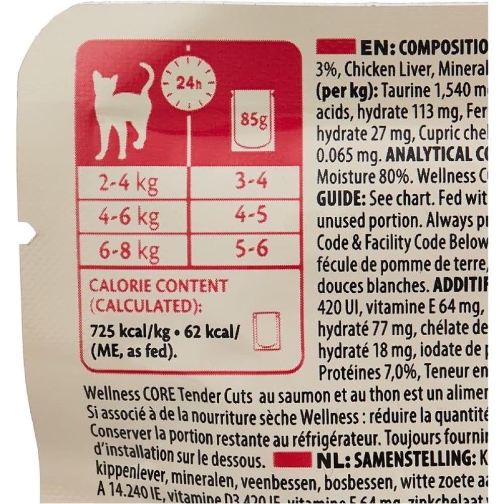 Are you looking for a wet food that combines great taste and health benefits for your adult cat? Here's Wellness Core with tender meat chunks with delicious salmon and tuna in a delicious gravy. This product is specially designed to meet your cat's nutritional needs and provide an irresistible eating experience.